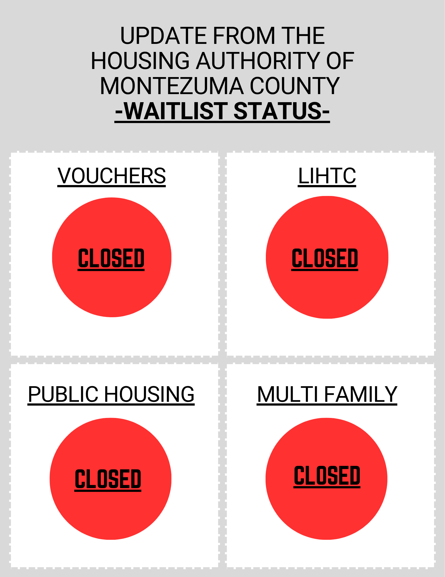 With support from the LOR Foundation, The Housing Authority of Montezuma County is able to offer a Rental and Deposit Assistance Grant Program. We are very excited and grateful to be able to offer this program to tenants so they are able to remain housed and avoid eviction. Please contact our office for more information and an application.